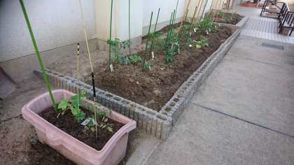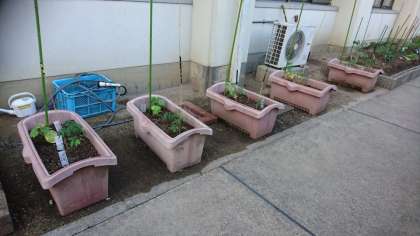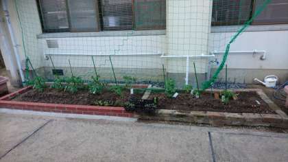 3年生の技術の時間に取り組んでいる生物の育成、トマト・ナス・キュウリが、成長しています。