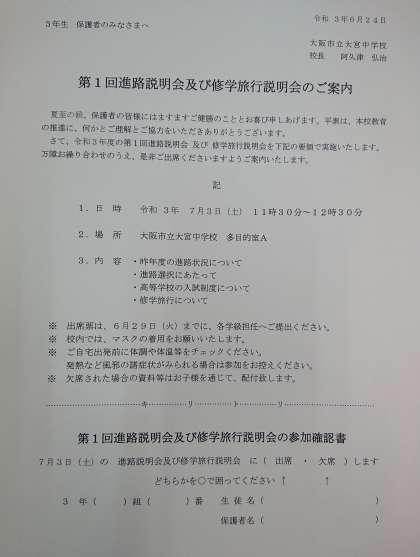 7月3日(土)11:30〜12:30 大宮中学校 多目的室Aにて、3年生の進路に関する説明会及び修学旅行の説明会を実施いたします。