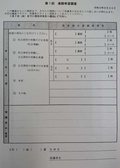 見通しを持った進路決定がなされるように、努めてまいりますが、各ご家庭でもお子様とお話しを深めていただき、7月7日(水)までにご提出をお願いいたします。
