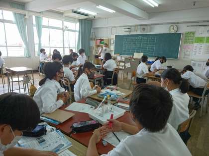 2年生の理科の時間に感染症対策を講じて、白い粉末状の物質を区別する実験を行いました。自ら実験し、確認とまとめを行いました。