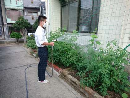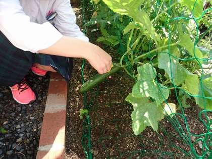 3年生の当番の人たちが毎日朝の水やりをして、こんなに大きなキュウリを収穫することができました。