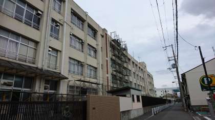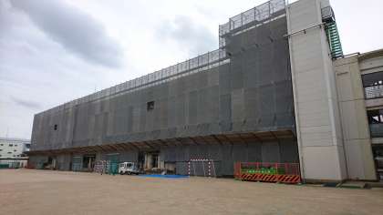 校舎南棟の運動場側には、足場とシートが設置され本格的な工事が始まっています。道路側(南側)にも今後、足場が設置され本格的な工事が進みます。