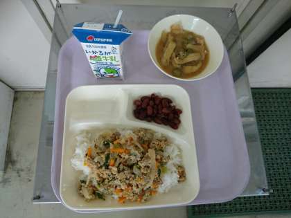 他人丼、とうがんのみそ汁、金時豆の煮もの、牛乳です。