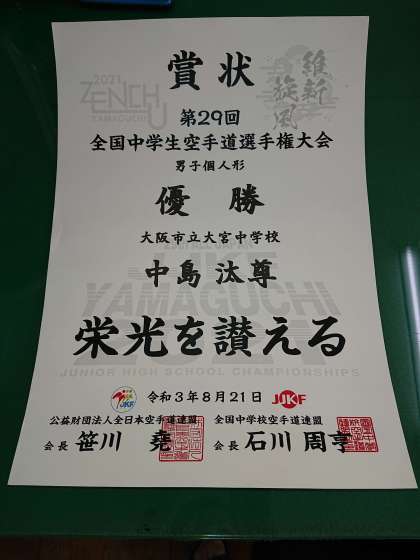 本校3年生、中島汰尊くんが、夏休みに行われた「第29回全国中学生空手道選手権大会 男子個人型」に出場し、見事優勝しました。