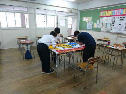 体育大会当日に向けて、学級旗の仕上げに入っています。