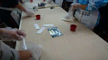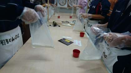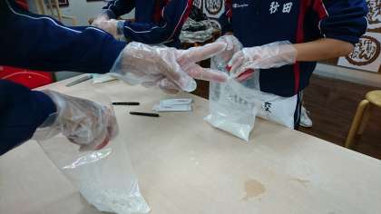 食塩水と小麦粉を混ぜて生地の作成体験を行っています。