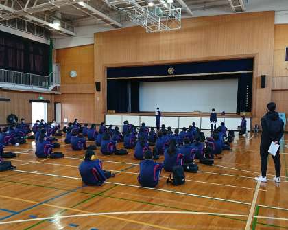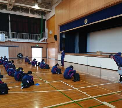 体育館で集合し、委員長中心に出発式を行い、バス乗車に向かいます。