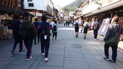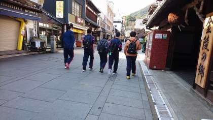 金比羅山、班別自主研修に出発しました。それぞれの班が目標をたてた所まで階段を登っていきます。頑張ってください。