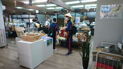 金比羅山での班別自主研修を終え、お土産を購入しました。昼食場所のさぬき麺業に向けてバスで向かっています。