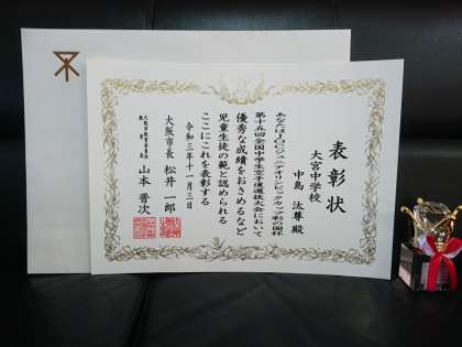 本日の全校集会で、第73回大阪市立校園生徒表彰としてJOCジュニアオリンピックカップ彩の国杯第15回全国中学生空手道選抜大会で優勝した、本校3年中島汰尊さんの表彰を行いました。
