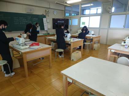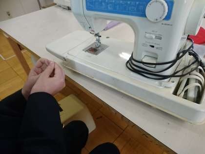 ミシンの上糸を針に通す作業に取り組んでいます。