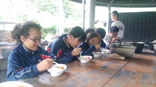 メニューはカレーライス。かまどに火を熾し、米を研ぎ炊き、カレーを煮込んで出来上がったのが午後2時頃。少し水分の多いご飯やおこげご飯になった班もありましたが、カレーはどの班も上出来で皆美味しそうに頂いていました。
