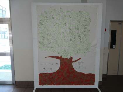 みんなが考えて作った一枚一枚の葉っぱを集めて、生徒会で「いじめについて考える木」を作り、ピロティーに展示しています。さまざま人の意見を見てください。そして友達をいじめない、友達に対していやがる行動をしている人を見かけたら「やめようや」と勇気をもって止められる人になってください。