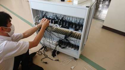 本日、14時30分より実施するオンライン接続に向けて、一人一台端末、充電保管庫、アダプター等の整備を行いました。