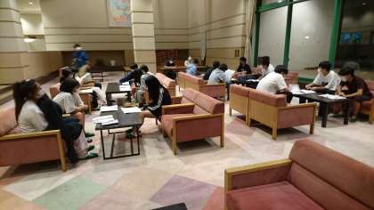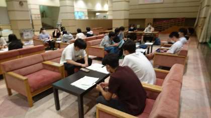 夜の散歩を終え。室長会議の時間となりました。今日の振り返りと明日に向けての確認を行っています。この後、就寝準備を行い消灯となります。睡眠をしっかりとって明日に備えてください。明日のホームページ更新を楽しみにしてください。