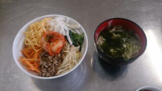 もやし、人参、大根のナムルや挽肉、キムチ入りの栄養満点のビビンパです。