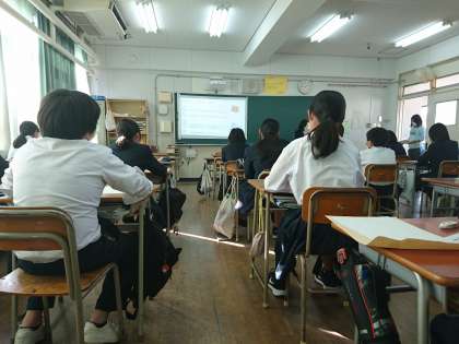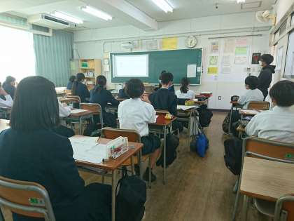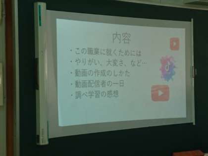 1年生が、11月10日(木)の5時間目に、これまで調べた職業について各学級でチームごとに発表会を行いました。