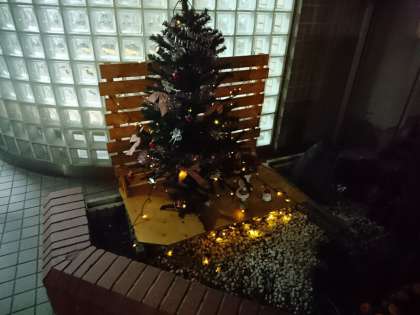正門入ってすぐのところには、イルミネーション点灯のクリスマスツリーを管理作業員さんと学校元気アップの方々に設置していただきました。