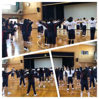 ラジオ体操を練習しています。 声を出して、息を合わせて! はつらつと動いています!
