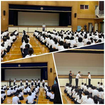 最初にラグビー部と吹奏楽部に賞状伝達を行い、校長先生と生徒指導主事からお話がありました。