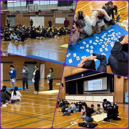 12のグループに分かれて自己紹介をした後に、英語でクイズやカルタにチャレンジしました。
