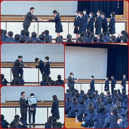 ソフトテニス部と男子バスケットボール部、そして校外のダンスチームでの活躍を表彰しました。