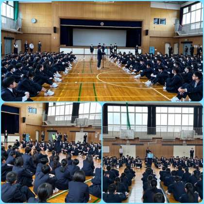 ソフトテニス部の活躍を紹介したのちに、校長先生からは「何でもいいから一番をめざそう!」「時間を意識して生活しよう」というお話。