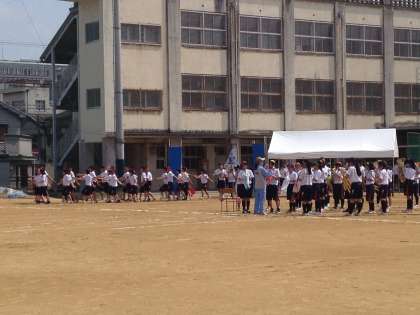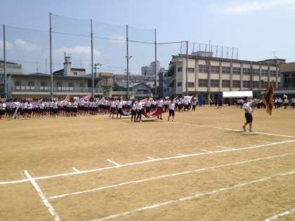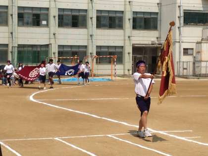 入場行進の様子です。吹奏楽部の演奏をバックに、生徒会長の石橋くんを先頭に校旗・生徒会旗、続いて3年2年1年の順に入場します。