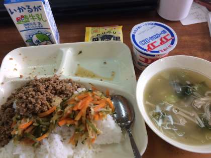 ビビンバは「混ぜごはん」という意味だそうです。の具材は、ごはんと分けて配膳されますが、ご飯にのせて写真を撮りました。食器が汚くて申し訳ありません…。