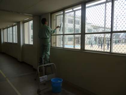 昼休み、管理作業員さんが窓の清掃をしていました。