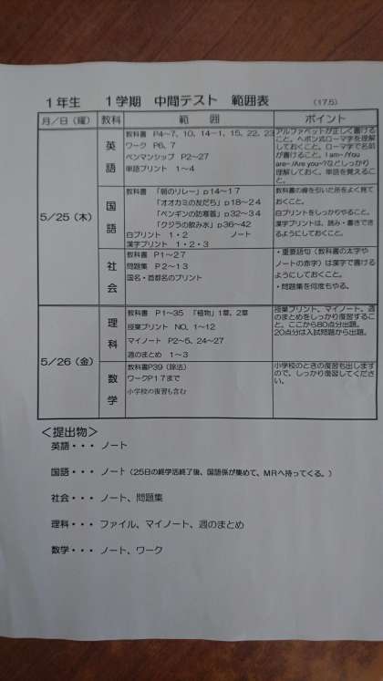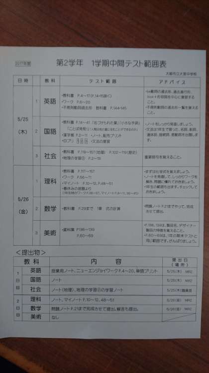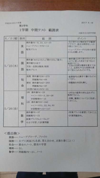 (上から順に、1年・2年・3年のテスト範囲表です)