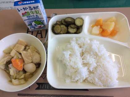 今日の八宝菜には、豚肉、うずら卵、キャベツ、たまねぎ、たけのこ、ピーマン、しいたけの8種類の材料が使われています。