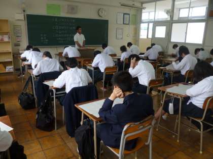 写真は3年生各クラスの3時間目、社会のテスト中です。