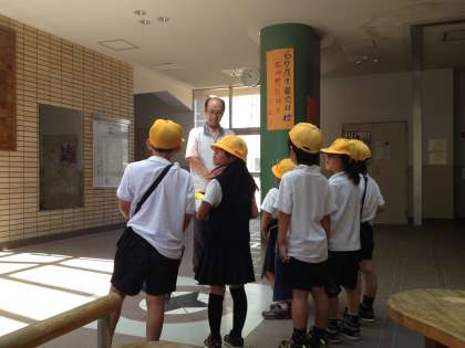 6月14日金曜日、3時間目に大宮西小学校2年生の児童たちが「まちなか探検」の授業で大宮中学校を訪問してくれました。高久裕次先生の説明を熱心に聞いていました。