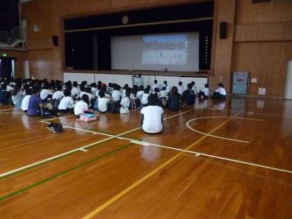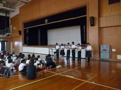 生徒会から中学校生活の様子などを説明し、今年の体育大会の3年生学年演技のVTRを見ました。そして、小学生からの質問に、生徒会が答えていました。