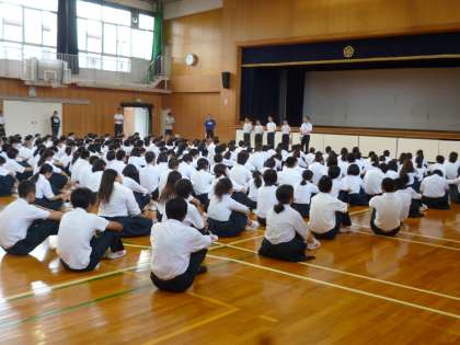昨晩の豪雨により、グランド状態が不良のため、全校集会を体育館で行いました。