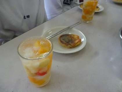 「ファチェ」は、まずコップにフルーツ(かんづめ)をいれます。そこにソーダを注ぎ、松の実を数粒入れたら完成です。