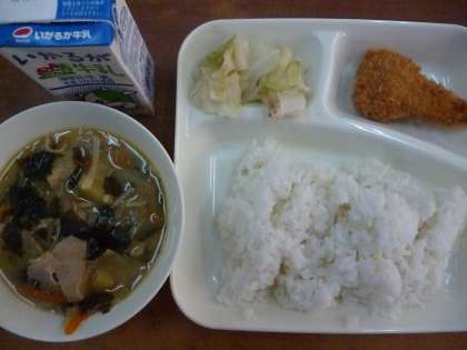 今日の豚汁は、米みその赤みそと白みそをまぜて味つけしています。