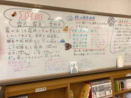 一番上の写真は、11月の図書室ホワイトボードのディスプレイです。
