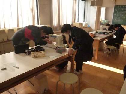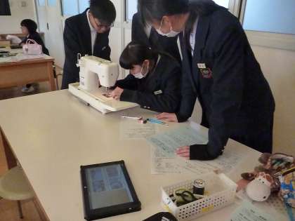 タブレットを使い、動画を参考にしながら、基礎縫いの練習をしています。