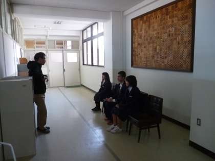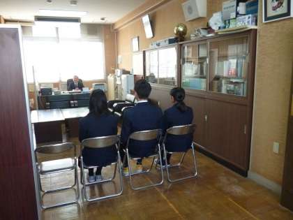 校長室の前で待っている生徒は、学年の先生と面接に臨む姿勢の最終確認をしていました。