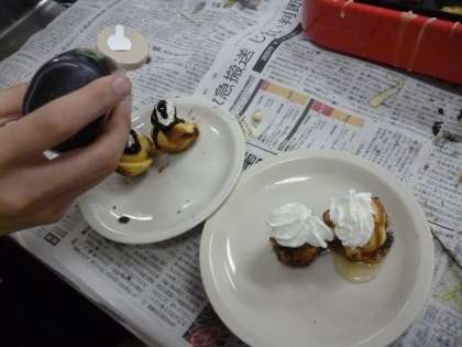 チョコやはちみつ、クリームをかけて、おいしくできあがりました!
