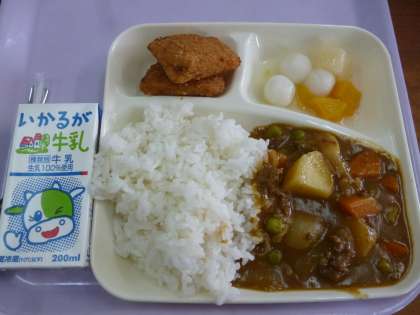 子どもたちの大好きなカレーライスに、一口トンカツを添えて食べます。