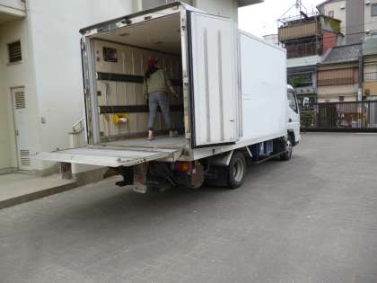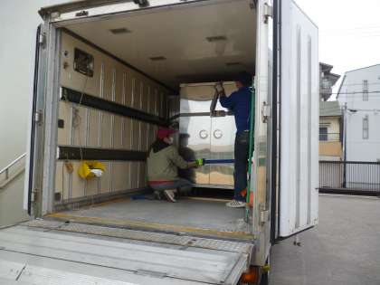 写真は給食が終わって、食器等をコンテナに入れ、トラックに運び込んだ様子です。