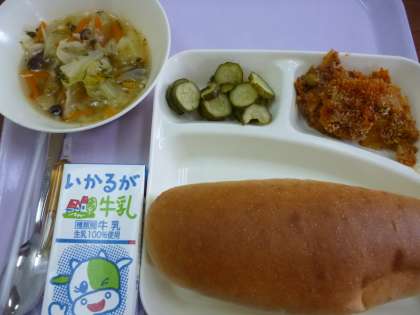 従来、じゃがいものミートグラタンは、焼くときにパン粉と粉末チーズを混ぜ合わせたものをかけていましたが、牛乳・乳製品のアレルギーの生徒も食べることができるよう、粉末チーズをのぞき、パン粉だけで仕上げています。