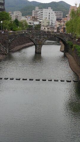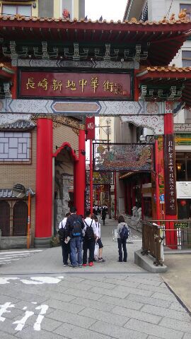 眼鏡橋と新中華街でチェックを受ける班員たち。