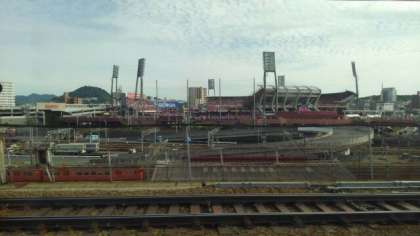 新幹線は予定通り運行中。 車窓からみる真っ赤に染まるマツダスタジアム。