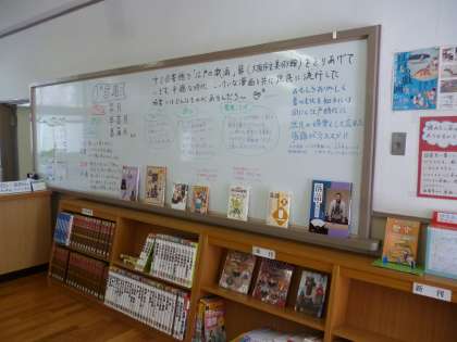 現在の飾りつけは、古典芸能。6月16日の土曜授業では、本物の落語家さんにお越しいただき、芸術鑑賞会を行います。それに向けて、おすすめの本を紹介しています。