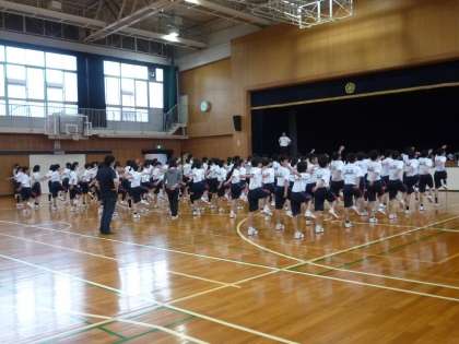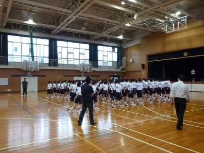 1年生の学年練習は、悪天候のため、体育館で行いました。