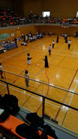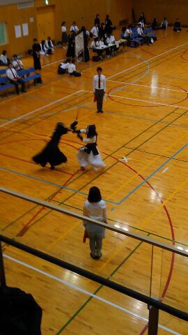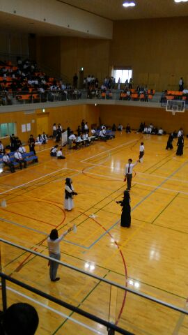 女子個人戦の様子です。綺麗な礼で始まりました。藍色の剣道着(たすきは白色)が本校の生徒です。